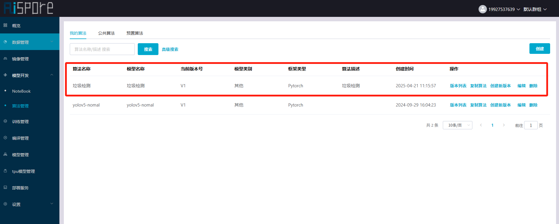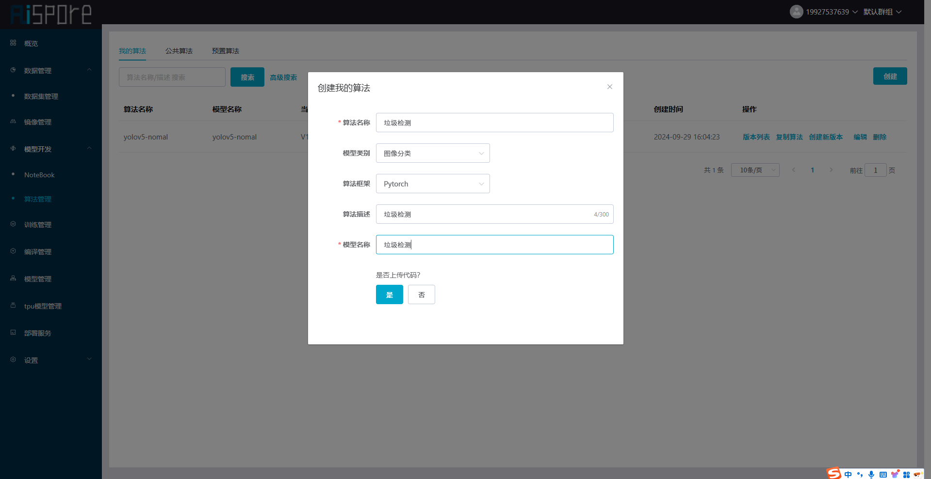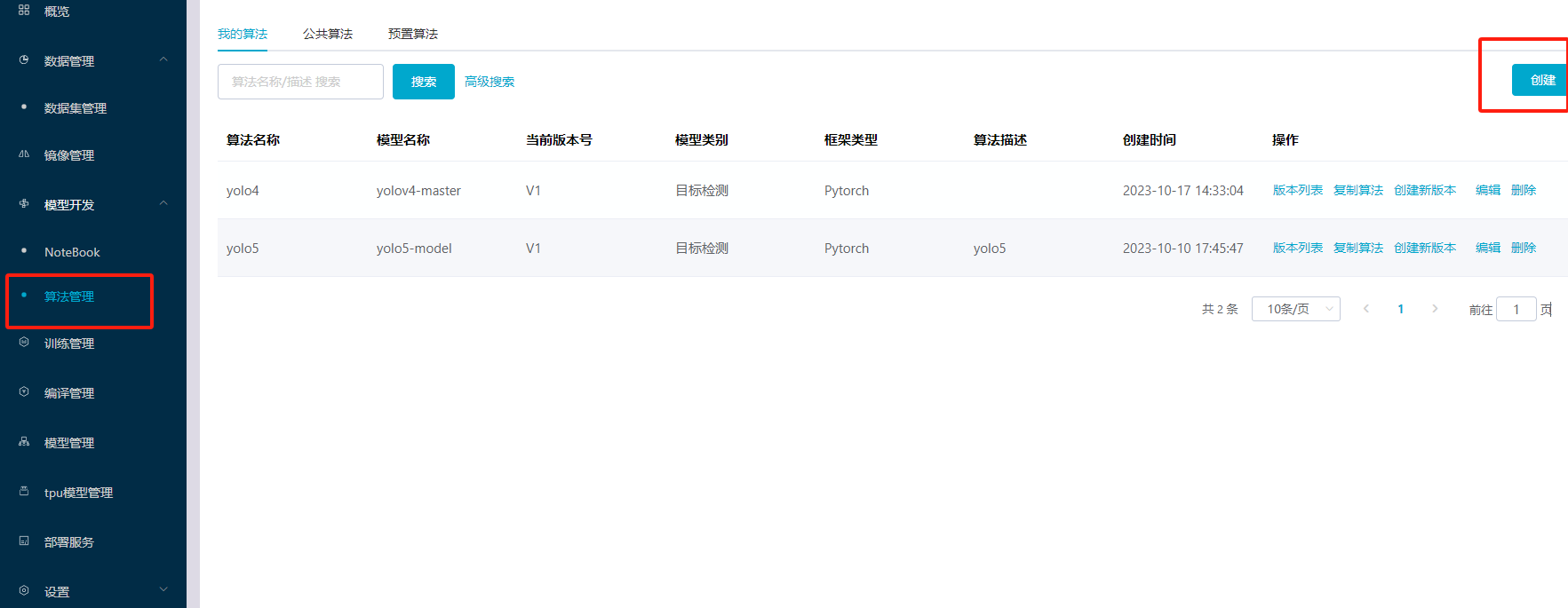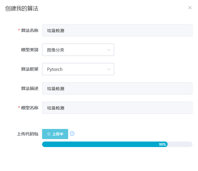 2.1点击算法管理,点击创建  2.2输入算法名称,模型类别,算法框架,算法描述与模型名称  2.3点击蓝色按钮是,上传自己的项目文件(ZIP),上传ZIP文件后,平台会自动解压至/code目录  2.4完成创建算法后,可以在我的算法中查看刚刚创建的算法