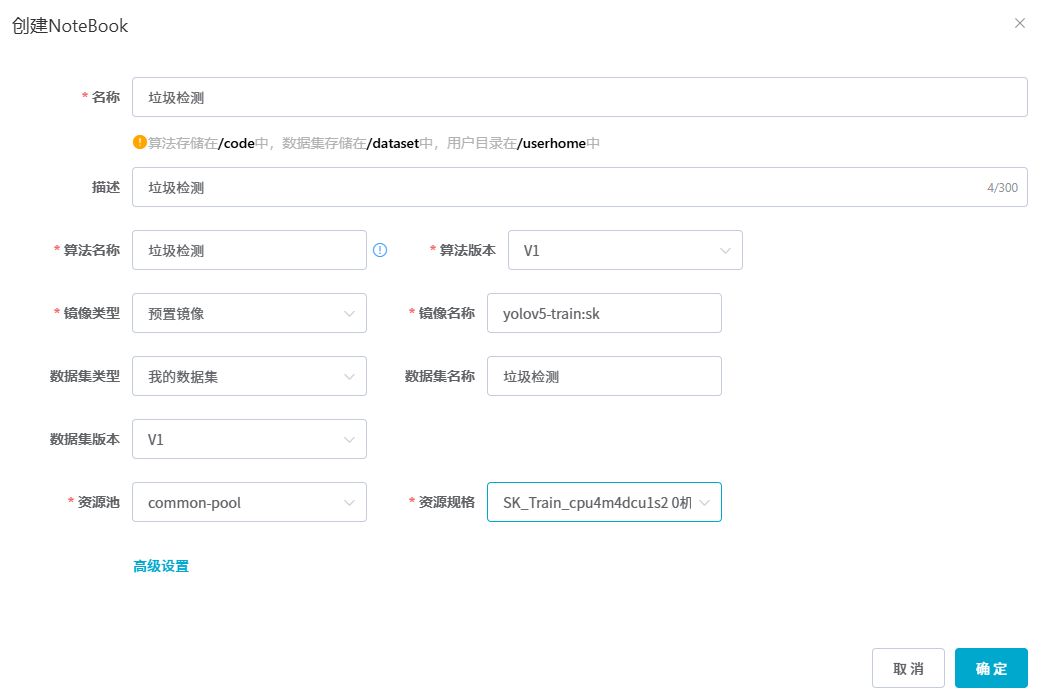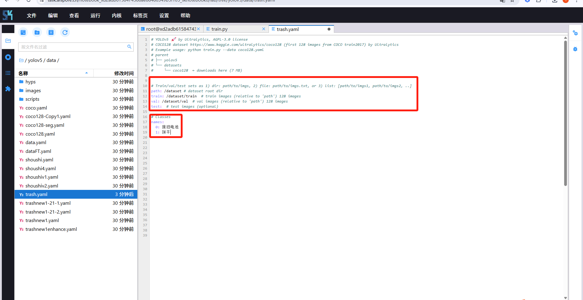 3.1当算法创建好后,在NoteBook中进行训练代码编写 3.1.1NoteBook创建  3.1.2NoteBook配置  3.1.3Note配置完成后点击确认,然后即可在NoteBook列表中看到刚刚创建的项目,点击打开  3.2进行训练环境的配置 3.2.1进入NoteBook,查看到自己的项目后就可以配置环境了,安装相关依赖  3.2.2编写训练文件,训练文件代码根据自己的需求进行编写,但在平台进行训练需要修改好数据集路径跟模型保存路径,以下操作为垃圾检测yolov5为例展示操作 3.2.3进入终端,找到我们的数据集,输入这些指令进行操作,数据集路径为(dataset,dataset/train ,dataset/val)  3.2.4设置数据集路径,点击yolov5  3.2.5找到并进入train.py文件,查找红色方框内的代码,这是data的路径 (data/trash.yaml)  3.2.6我们去data目录寻找trash.yaml文件 设置我们数据集的路径  3.2.7找到之后修改我们的path train val的路径,把我们之前找到的数据集路径对照修改数据集路径为(dataset,dataset/train ,dataset/val)  3.2.8修改完数据集的路径后,再修改我们标签名classes  3.2.9回到终端,进入code目录,再进入yolov5目录下进行训练  命令行指令为: 1.cd code ==(进入code目录)== 2.cd yolov5 ==(进入yolov5目录)== 3.python train.py --epochs 1 --batch-size 8 --imgsz 256 ==(其中Epochs是训练次数、Batch是一次获取多少张图片、Imgsz是图片像素大小)== 3.2.10出现以下代码表示训练成功而且已完成,训练好的模型存在红色的方框内  3.2.11如果要进行增量训练,需要用到我们上次训练出来的代码,代码如下 python train.py --epochs 1 --batch-size 8 --imgsz 256 --weight runs/train/exp7/weights/best.pt
