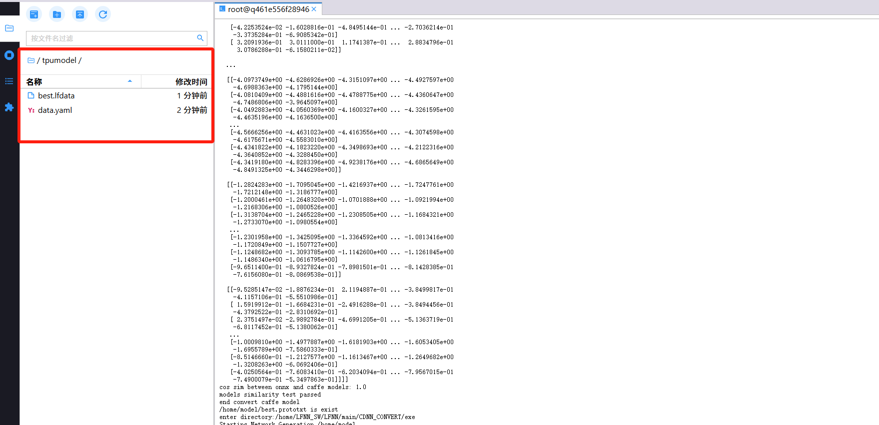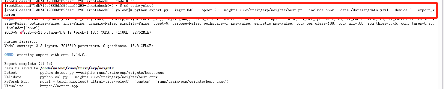 5.1终端进入yolov5目录中,将刚刚训练得到的模型文件:pt文件转为onnx文件,代码如下: cd code/yolov5 python export.py --imgsz 640 --opset 9 --weights runs/train/exp/weights/best.pt --include onnx --data /dataset/data.yaml --device 0 --export_kneron ==(其中imgsz指输入图像尺寸、opset指ONNX算子集版本、weights指训练好的模型权重路径、include指导出格式为ONNX、data指数据集路径、device指使用的设备为GPU或CPU、--export_kneron指针对AMC芯片的特殊导出模式)==  5.2返回平台NoteBook界面,创建一个用于编译的NoteBook项目(需要保证算法选择与训练时一致)   5.3打开编译项目  5.4运行编译,代码如下: export PATH="/home/LFNN_SW/LFNN/main/CDNN_CONVERT/exe:$PATH"&&export LD_LIBRARY_PATH="$LD_LIBRARY_PATH:/home/LFNN_SW/LFNN/main/CDNN_CONVERT/Dll/LINUX"&&export PYTHONPATH=/home/ONNXToCaffe:/home/caffe-py3/python:&&export PATH=/home/LFNN_SW/LFNN/main/LFNNBin/exe:/home/ONNXToCaffe:/home/protobuf/bin:/usr/local/sbin:/usr/local/bin:/usr/sbin:/usr/bin:/sbin:/bin&&cd /home&&cp /dataset/data.yaml ./&&cp /code/yolov5/runs/train/exp/weights/best.onnx ./model/&&python3 create_csv.py --onnx_model /home/model/best.onnx --csv_filename best.csv --model_input1_shape3=640&&find /dataset/train -name "*.jpg"| shuf -n 20 | xargs -I {} cp {} /home/model/&&mv best.csv ./model/&&bash ./compile.sh /home/model/best.onnx&&mv /home/model/*.lfQdata /code/tpumodel/best.lfdata&&mv data.yaml /code/tpumodel ==此为多段命令组合,具体含义分解如下:== **5.4.1export PATH="/home/LFNN_SW/LFNN/main/CDNN_CONVERT/exe:$PATH"** 将路径 /home/LFNN_SW/LFNN/main/CDNN_CONVERT/exe 添加到 PATH 环境变量中,使该目录下的可执行文件可以在任意位置直接调用。 **5.4.2export LD_LIBRARY_PATH="$LD_LIBRARY_PATH:/home/LFNN_SW/LFNN/main/CDNN_CONVERT/Dll/LINUX"** 将动态库路径 /home/LFNN_SW/LFNN/main/CDNN_CONVERT/Dll/LINUX 添加到 LD_LIBRARY_PATH,确保程序运行时能找到所需的共享库。 **5.4.3export PYTHONPATH=/home/ONNXToCaffe:/home/caffe-py3/python:** 将两个路径添加到 PYTHONPATH,使 Python 可以导入这些目录下的模块: /home/ONNXToCaffe:ONNX 转 Caffe 的工具路径。 /home/caffe-py3/python:Caffe(Python 3 版本)的接口路径。 **5.4.4export PATH=/home/LFNN_SW/LFNN/main/LFNNBin/exe:/home/ONNXToCaffe:/home/protobuf/bin:/usr/local/sbin:/usr/local/bin:/usr/sbin:/usr/bin:/sbin:/bin** 覆盖 PATH 变量,按顺序添加以下路径:(1)LFNN 工具链的可执行文件路径。(2)ONNX 转 Caffe 工具路径。(3)Protocol Buffers(protobuf)的可执行文件路径。(4)系统默认路径(如 /usr/bin)。 **5.4.5cd /home** 切换到 /home 目录。 **5.4.6cp /dataset/data.yaml ./** 将数据集配置文件 data.yaml 从 /dataset 复制到当前目录(/home)。 **5.4.7cp /code/yolov5/runs/train/exp/weights/best.onnx ./model/** 将训练好的 YOLOv5 模型文件 best.onnx 复制到 /home/model/ 目录。 **5.4.8find /dataset/train -name "*.jpg" | shuf -n 20 | xargs -I {} cp {} /home/model/** 在 /dataset/train 中查找所有 .jpg 文件,随机选取 20 个文件(shuf -n 20),将这些文件复制到 /home/model/。 **5.4.9mv best.csv ./model/** 将生成的 best.csv 移动到 /home/model/。 **5.4.10python3 create_csv.py --onnx_model /home/model/best.onnx --csv_filename best.csv --model_input1_shape3=640** 运行 Python 脚本 create_csv.py,将 ONNX 模型转换为 CSV 文件。其中onnx_model指输入模型路径、 csv_filename指输出 CSV 文件名、model_input1_shape3=640指定模型输入张量的某一维度为 640。 **5.4.11bash ./compile.sh /home/model/best.onnx** 执行编译脚本 compile.sh,将 ONNX 模型转换为目标格式。 **5.4.12mv /home/model/*.lfQdata /code/tpumodel/best.lfdata** 将生成的.lfQdata文件重命名为best.lfdata并移动到 /code/tpumodel(TPU模型存储目录)。 **5.4.13mv data.yaml /code/tpumodel** 将数据集配置文件 data.yaml 移动到 /code/tpumodel 。 5.5编译完成后会出现文件夹tpumodel,进入可以看见编译好的best.lfdata文件