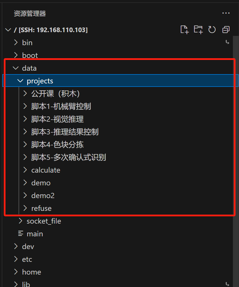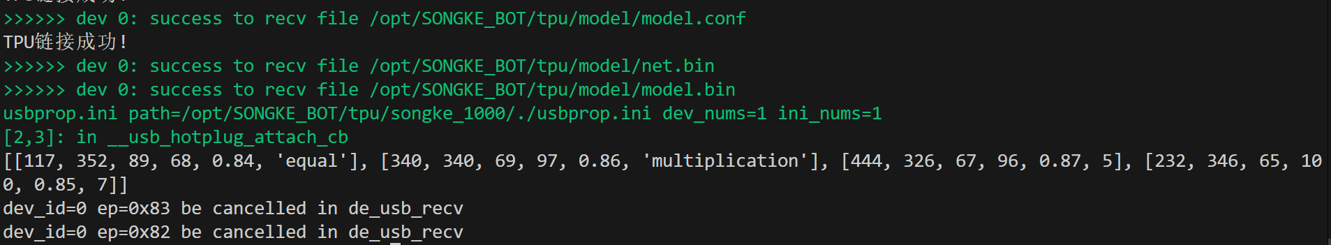 7.1基于机器人:TPU插机械臂上,电脑连接机械臂(无线)。机械臂拍照,在TPU上进行推理,TPU得到推理结果返回给机械臂。电脑全程没有参与,电脑只是与机械臂进行数据传输,从而让电脑可以显示机械臂的信息。 7.1.1将电脑与机械臂置于同一局域网下进行无线连接(详见电脑与机器人连接说明),打开电脑终端查看是否连接成功。 ping 192.168.110.103(此为机械臂无线地址)  7.1.2打开vscode或pycharm,使用ssh远程连接机械臂  7.1.3连接成功后即可进入data/projects目录中查看刚刚固化好的模型,模型名称为固化时的名称,/data/projects为TPU模型的存放目录。  7.1.4进入刚刚固化好的模型目录中,新建tpudetect.py文件进行本地推理,代码如下: ```python from arm_module import Control_Arm as arm #机械臂 from tpu_module import Control_TPU as tpu #TPU from cap import VideoCapture #摄像头 mode = False #无线远程连接 model_name = "demo" #模型名称 conf = 0.5 #精度 iou = 0.45 #IoU阈值 width = 640 #图片宽度 height = 640 #图片高度 arm.reset_position() #机械臂复位 cap = VideoCapture() #调用摄像头拍照 img = cap.read() #读取图片 result = tpu.predict(img, mode=mode, model_name=model_name, conf=conf, iou=iou, w=width, h=height) print(result) cap.release() #释放摄像头资源 ``` 7.1.5在终端运行代码,首先使用 sudo su进入超级root权限 python3 tpudetect.py运行Python文件  出现结果,推理完成。  7.2基于windows系统:TPU插在电脑上,配置本地环境,进行TPU模型推理。 7.2.1安装anaconda进行python环境管理 安装教程可参考:https://www.cnblogs.com/ajianbeyourself/p/17654155.html 7.2.2进入Anaconda Prompt 创建虚拟环境,输入conda create -n amc python=3.9 7.2.3进入创建的环境 conda activate amc 7.2.4下载解压本地推理附件压缩包,从prompt进入目录安装相关依赖 cd /Desktop/AMC_release/tests pip install -r requirements.txt 7.2.5安装ai_stick包,进入host-sdk文件下: cd ../host-sdk pip install ai_stick-1.1.1-py3-none-any.whl 7.2.6模型推理 7.2.6.1检测模型推理(以垃圾检测模型为例) (1)在tests文件下,创建garbage文件 (2)将测试图片、模型和yaml文件放到garbger文件下 (3)进入tests文件下,执行推理 cd tests python yolov5s_det_inference.py -m garbage_48.lfQdata -i garbage -s 3x640x640 -t 0.5 -n 0.45  参数解释: -m, --model_name: 模型名称(必要) -i, --input_file: 包含图片、模型和yaml文件的文件夹名称(必要) -s, --input_size: 模型输入的size,默认3x640x640(可选) -t, --obj_thresh: 目标检测阈值,默认0.5(可选) -n, --nms_thresh: IOU阈值,默认0.45(可选) 7.2.6.2分类模型推理(以水果分类模型为例) (1)在tests文件下,创建fruit文件 (2)将测试图片、模型和yaml文件放到fruit文件下 (3)执行推理 python yolov5s_cls_inference.py -m garbage_48.lfQdata -i garbage -s 3x224x224  参数解释: -m, --model_name: 模型名称(必要) -i, --input_file: 包含图片、模型和yaml文件的文件夹名称(必要) -s, --input_size: 模型输入的size,默认3x224x224(可选) ==注意:若出现libusb文件缺失,则将附件压缩包中的libusb-1.0.dll文件移动到C:\Users\32869\anaconda3\envs\amc\Library\bin目录下(即anaconda下的envs\amc\Library\bin)== 7.3基于linux系统:除了最开始需要进入root用户外,其他操作与windows系统相同。即在进入推理项目目录前先执行: sudo su 然后进入推理目录: cd /Desktop/AMC_release/tests 后续操作同windows