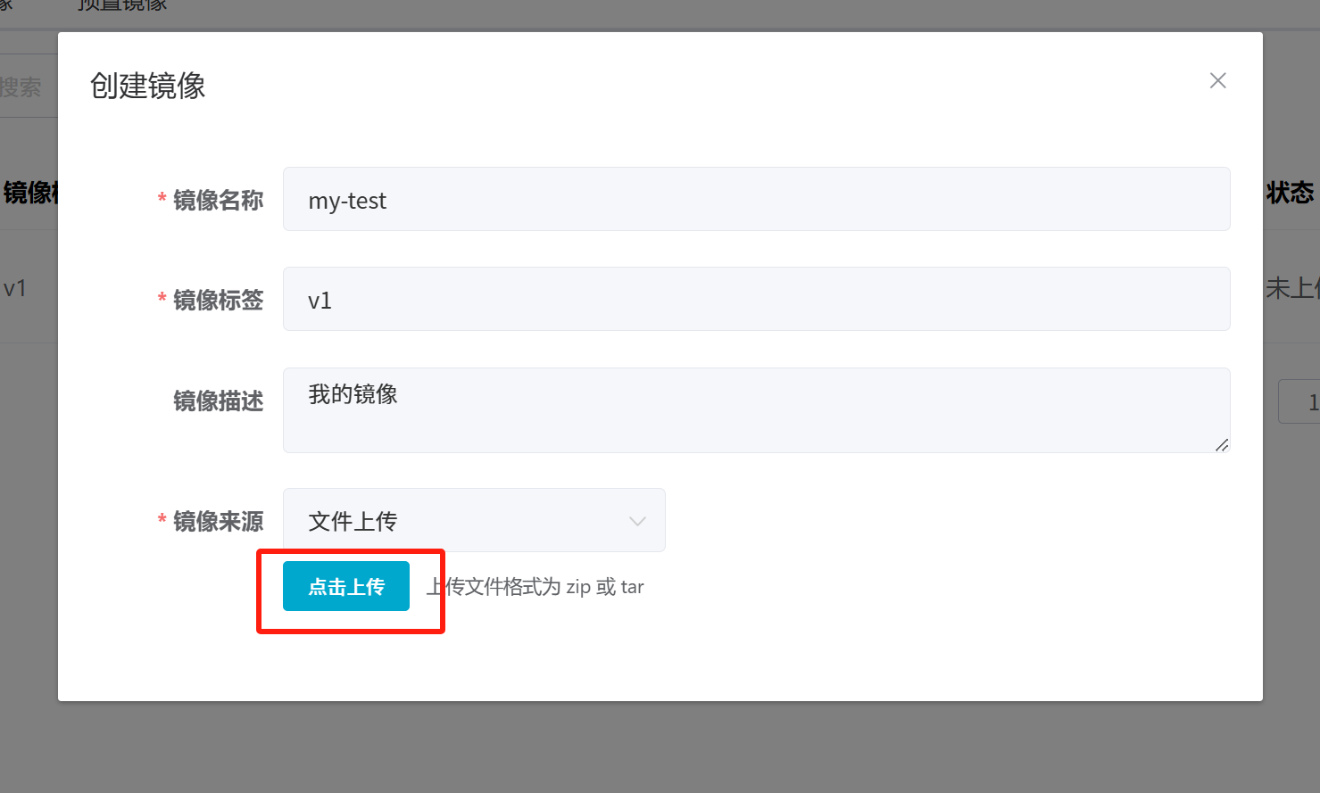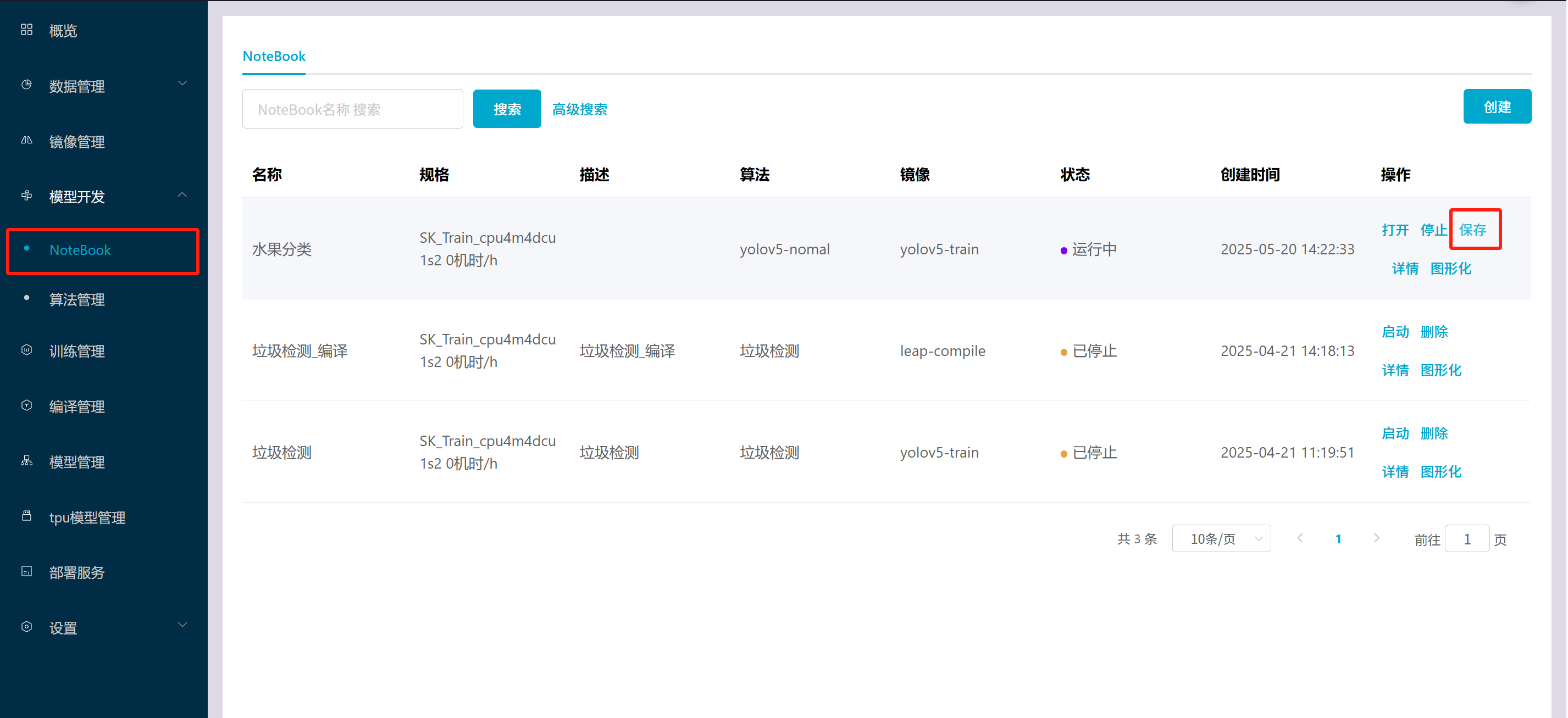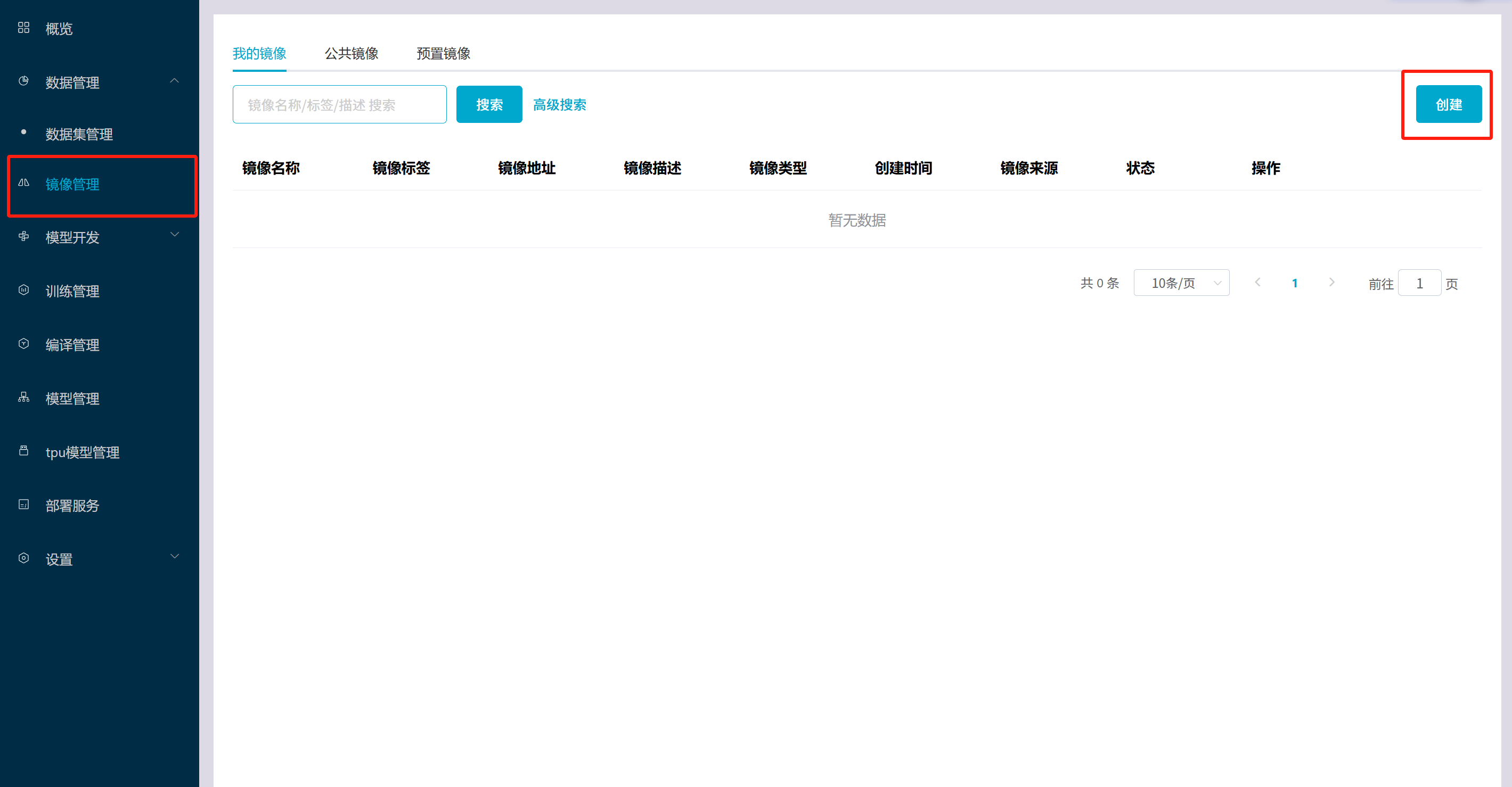8.1在模型训练创建notebook时,我们当时对镜像进行了选择,选择为预置镜像。如果我们想要使用我们自己的镜像,可以进入镜像管理菜单,点击创建镜像。  8.2在创建镜像中填写对应信息,可以选择: (1)远程镜像(输入远程镜像地址)  (2)文件上传(将本地镜像打包好上传至平台)  8.3创建成功后即可在镜像列表中看见  8.4若要执行notebook保存镜像,需要在notebook菜单下,进入notebook列表,选择需要保存的notebook项目,将其保存为镜像到我的镜像列表中。