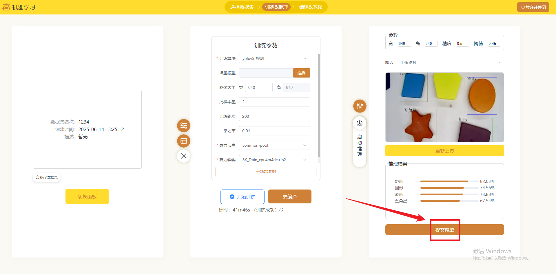 # 启动推理 完成模型制作后,可以上传图片,查看推理结果。  推理结果中精度如果不满意,可以返回到数据工程增加训练数据数据,或在训练界面调整训练参数,重新训练一个新的模型,直到推理结果满意。 完成推理结果后,点击“提交模型”,显示“提交成功”即完成初赛。  `注意,可以多次提交模型,以最新提交的模型为准。`