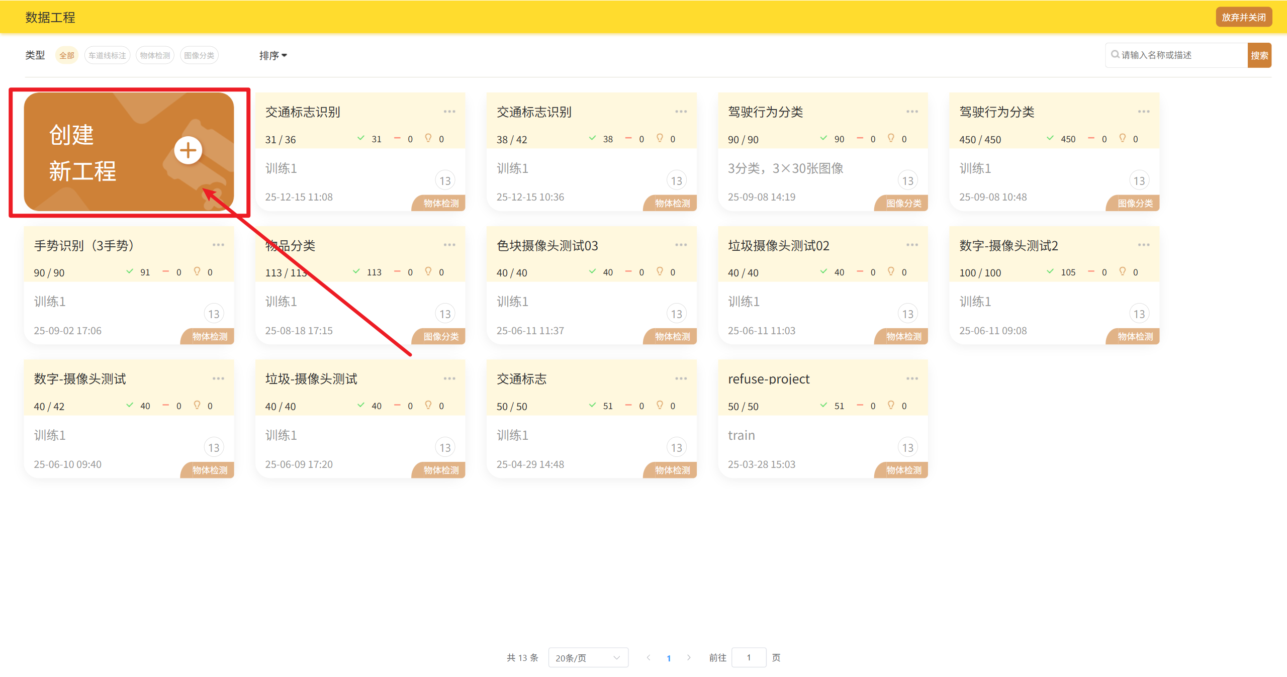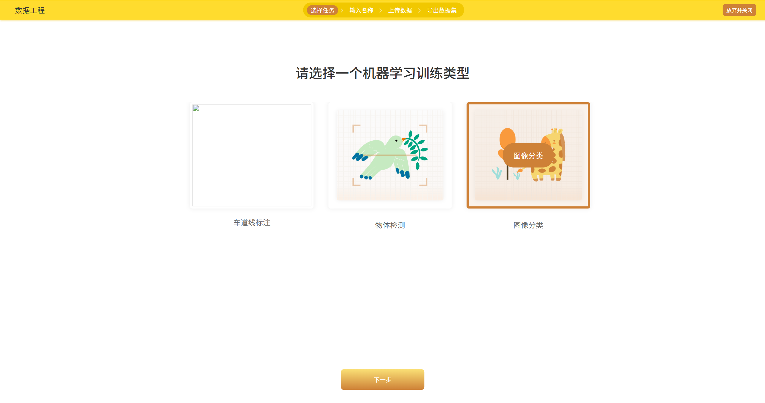 数据工程模块主要负责准备和处理训练AI模型所需的数据。  # 第一步:创建新工程  选择图像分类任务  # 第二步:创建分类 完成分类的创建后,可以给分类重命名或删除分类。  # 第三步:数据采集 对于分类任务而言,也同时支持拍照和本地上传两种方式进行数据采集。  # 第四步:导出数据集 完成数据标注的数据工程可以导出成数据集,一个数据工程可以导出多个数据集。  **下一步是:[模型训练](https://doc.aispore.cn/doc/74/ "模型训练")(可直接点击)**