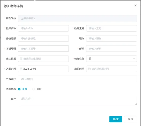## <人员管理-教师管理> (1)创建教师 ● 选择<人员管理-教师管理>菜单,点击【新增】,弹出添加老师详情弹窗。输入老师信息,点击确认则可以添加。 ● 其中所在学校、手机号码、邮箱确认后管理员不可修改。若修改学校可删除账号信息重新绑定学校;手机号码可由用户自己登录账号后修改。 ● 其中可先不配置,在创建完课程后进行配置。可教课程需要在分配课程前进行配置,为老师分配课程时,会收到可教课程的限制。  ● 支持批量导入创建教师。点击【导入】,下载模板填写后上传。 _1726192210.png) (2)搜索教师 ● 支持通过用户名、工号、名称、身份证、职称、联系方式、入职时间、离职时间、状态查询教师信息。 _1726192215.png) (3)编辑教师信息 支持编辑、删除教师信息。 ● 删除教师信息只是解除教师与学校的绑定关系。该账号仍可登录松科其他平台。 ● 手机号码及邮箱用作登录,仅账号本人可修改。 _1726192219.png) (4)课程安排 点击【查看】课程分配,则跳转到课程分配页面,查看该教师教授的班级及课程。