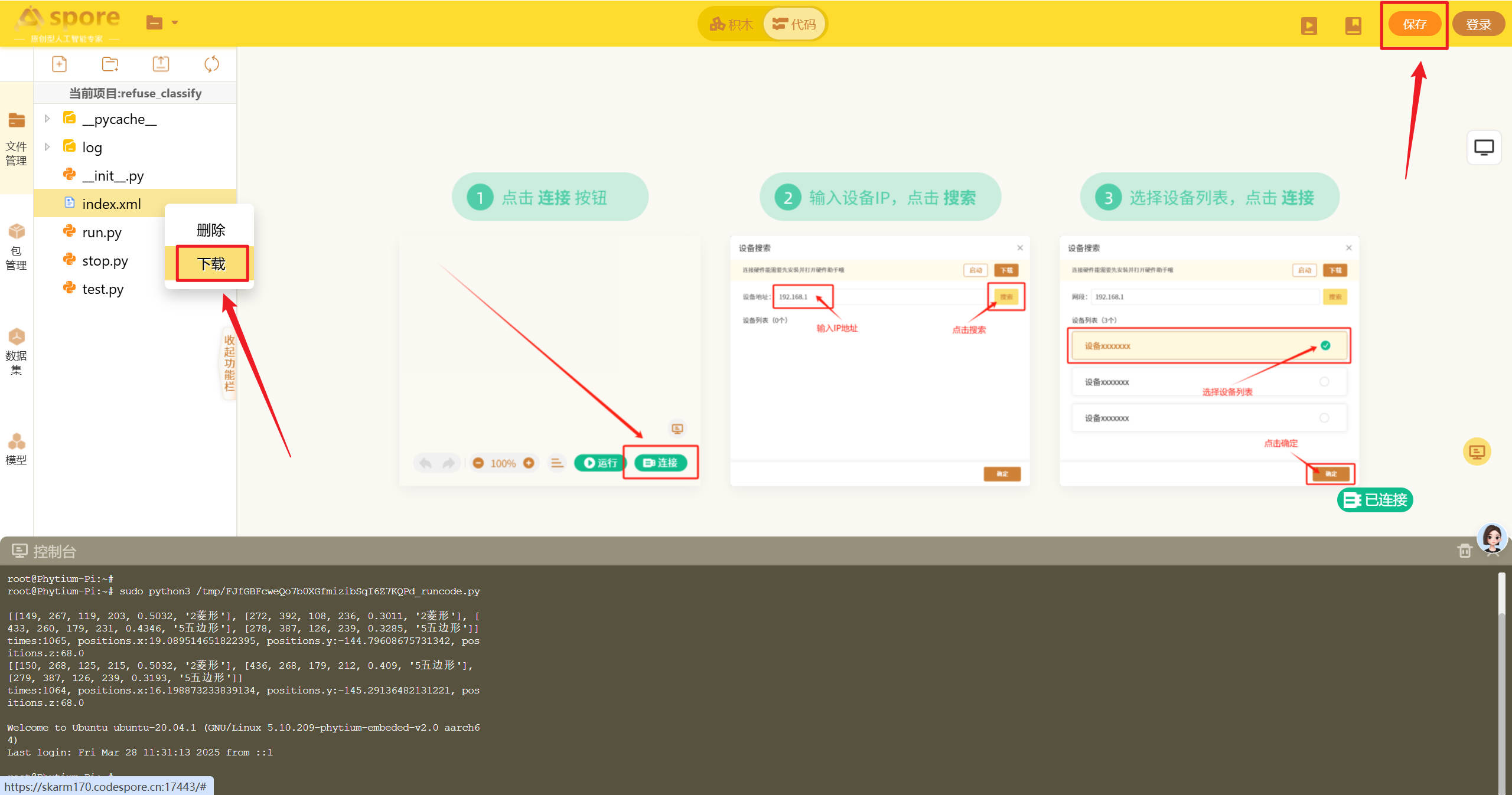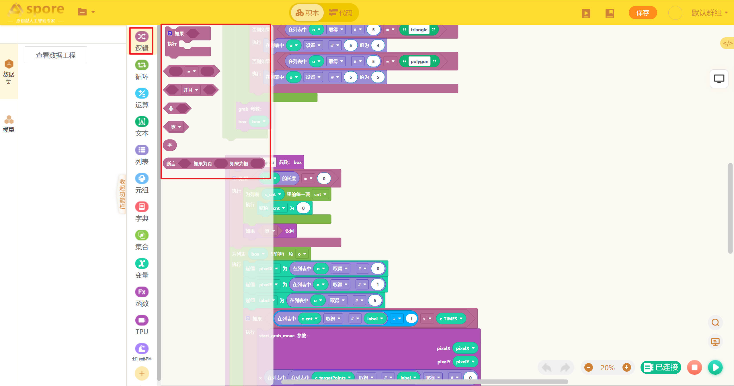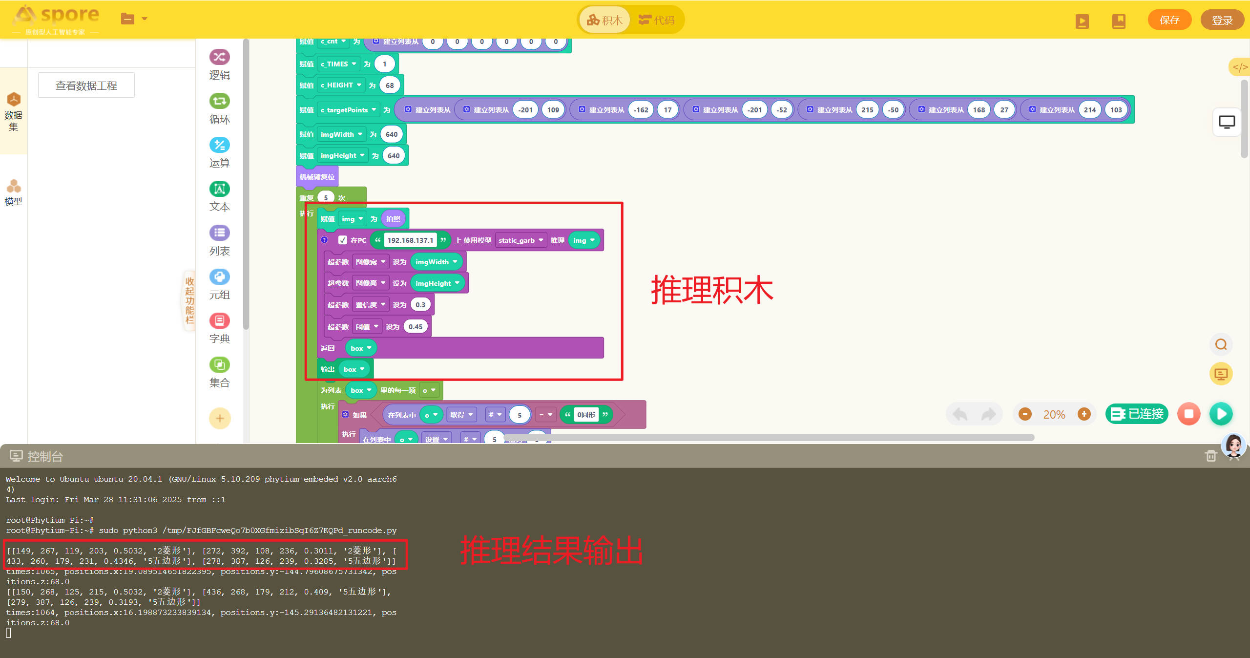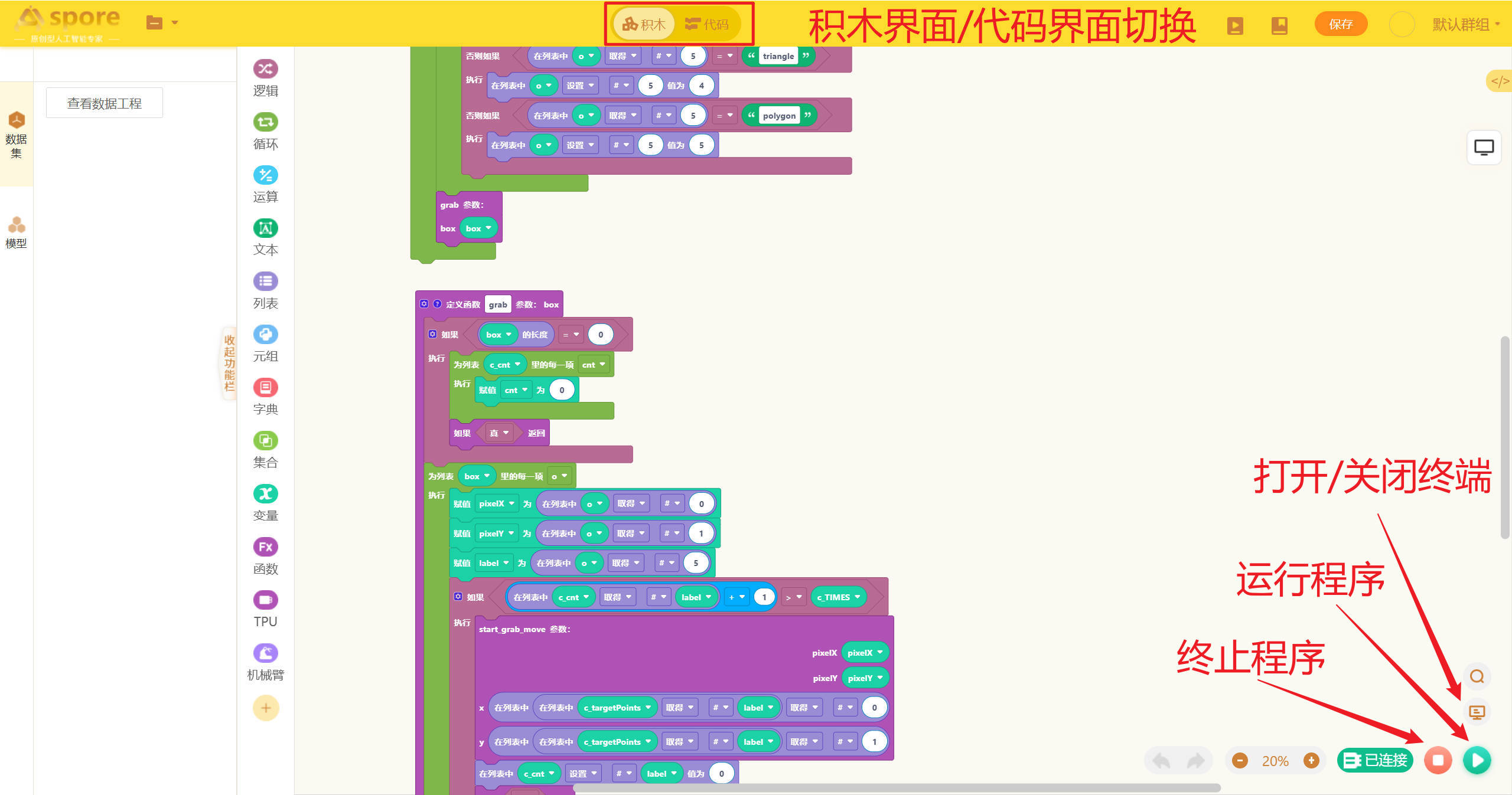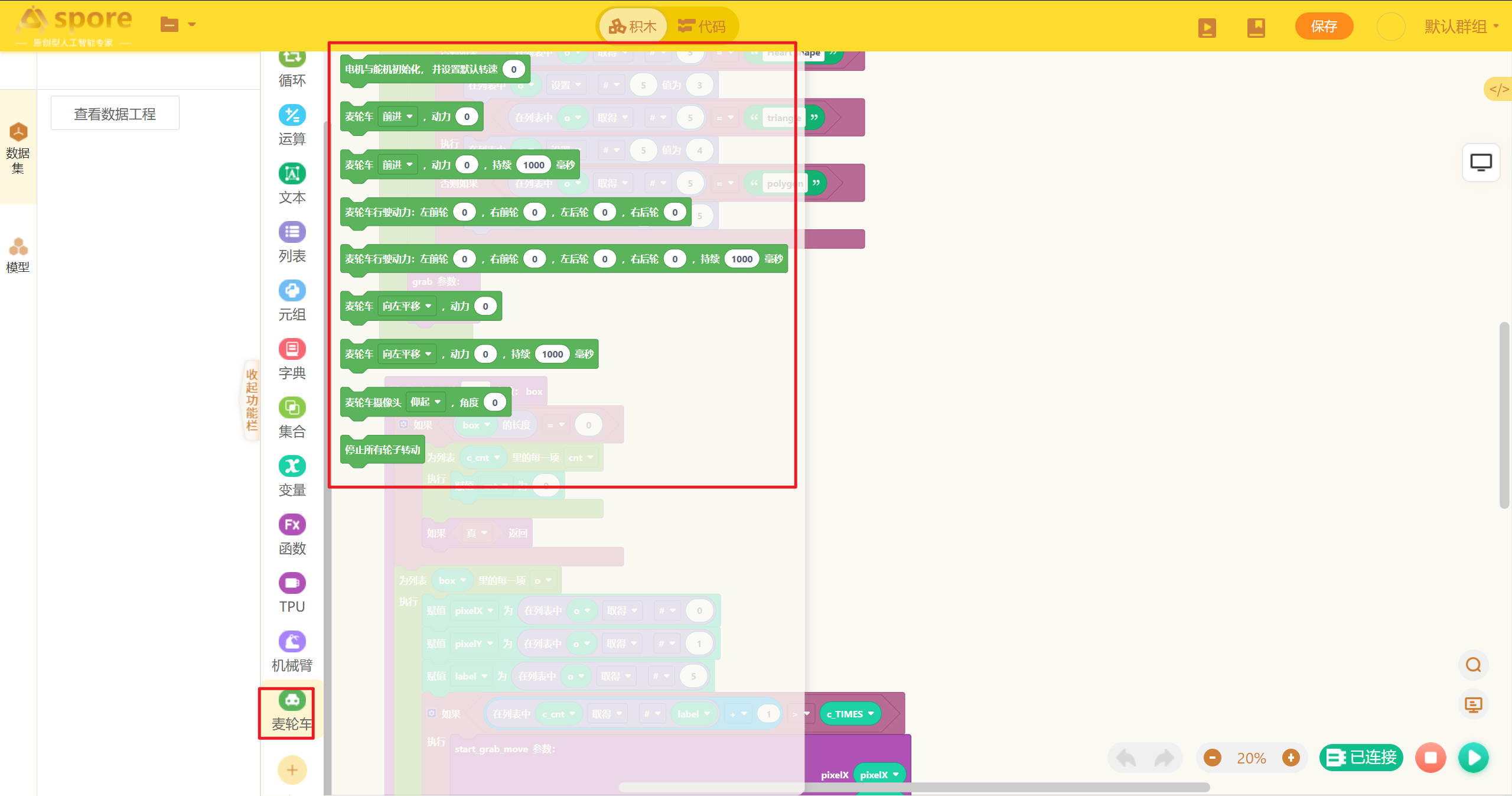 机器人编程模块的积木搭建部分是该平台的核心特色之一,它采用直观的积木式设计,让用户通过拖拽和组合代码块的方式构建程序,完全摆脱了传统编程的复杂语法。每个积木块代表特定的功能或指令,例如逻辑判断、循环结构、变量操作等,用户只需按照逻辑顺序将积木块拼接在一起即可形成完整的程序。  # 逻辑模块 逻辑模块用于实现程序的逻辑控制、判断以及断言等功能。例如进行条件判断,依据不同的条件执行不同的代码分支;设置断言,确保程序在特定条件下的正确性。通过合理运用逻辑模块,用户能够构建出严谨的程序逻辑架构,精确控制程序的执行流程。  # 循环模块 循环模块提供循环、sleep 函数以及跳出循环等功能。利用循环功能,用户可以让一段代码按照设定的次数或者条件重复执行;借助 sleep 函数,能够使程序在执行过程中暂停指定的时间;而跳出循环功能则可在满足特定条件时,提前结束循环。这些功能帮助用户高效处理重复性任务,合理控制程序的运行节奏。  # 运算模块 运算模块专注于数学计算相关操作。它涵盖了加、减、乘、除等基本数学运算,以及更为复杂的函数运算等。通过该模块,用户能够轻松处理各类数值计算,为程序赋予强大的数值处理能力,满足不同项目对数据运算的需求。  # 文本模块 文本模块主要负责文本输出、字符串相关的操作。它包含字符串输出函数,方便在程序运行过程中展示文本信息;还具备字符串替换、连接等函数和方法,可灵活处理和编辑字符串内容,满足项目中对文本处理和显示的多样化需求。  # 列表模块 列表模块集成了 Python 列表相关的函数和方法。用户可以利用它进行列表的创建、元素的添加与删除、查找元素以及对列表进行排序等操作。通过这些功能,用户能够高效地组织和管理数据,以列表的形式存储和处理多个相关数据项。  # 元组模块 元组模块提供 Python 元组相关的函数和方法。支持元组的创建,以及对元组元素的访问、切片等操作。元组的不可变特性使得它在存储一些固定数据组合时非常实用,该模块帮助用户更好地利用元组的特性,优化数据存储和处理方式。  # 字典模块 字典模块提供 Python 字典相关的函数和方法,包含了创建字典、添加和删除键值对、通过键获取对应值等函数和方法。用户能够借助字典模块,以键值对的形式高效存储和快速访问数据,为处理具有关联关系的数据提供了便捷的方式。  # 集合模块 集合模块实现了 Python 集合相关的函数和方法。它支持集合的创建、元素的添加与删除、集合间的交集、并集、差集运算等。这些功能帮助用户处理无序且不重复的数据集合,在数据去重、关系判断等场景中发挥重要作用。  # 变量模块 变量模块主要用于创建变量、进行变量赋值以及调用变量。用户可以根据项目需求自定义变量名,并为其赋予不同类型的值,在程序的不同位置调用这些变量,实现数据的传递和共享,进而实现数据的动态变化和复杂计算,使程序更加灵活。  # 函数模块 函数模块允许用户自定义函数并实现函数返回功能。用户可以将一段具有特定功能的代码封装成一个函数,通过定义函数参数和返回值,实现代码的复用。在程序中多次调用自定义函数,不仅简化了程序结构,还提高了代码的可读性和可维护性。  # TPU模块 TPU模块包含TPU模型推理函数和超参数设置功能。通过这个模块,用户可以调用TPU中的模型进行模型推理,根据返回的推理结果完成案例。  # 机械臂模块 机械臂模块包含机械臂运动控制相关函数。通过这些函数,用户可以精确控制机械臂的动作,如控制机械臂的移动、抓取和释放物体等操作,实现对机械臂的远程编程控制,满足自动化任务和机械臂相关项目的开发需求。  # 麦轮车模块 麦轮车模块提供麦轮车运动控制相关函数。利用这些函数,用户能够控制麦轮车的前进、后退、转向、调速等运动状态,实现对麦轮车的精准操控,为涉及麦轮车运动的项目开发提供有力支持,例如智能物流、机器人竞赛等场景。  # 效果展示 机器人编程模块的效果展示部分为用户提供了实时预览和调试的功能,能够直观地展示程序运行的结果。用户在搭建积木的过程中,可以随时运行程序,查看程序的运行结果,确保每个功能块按预期执行。通过即时反馈,用户可以快速发现问题并进行调整,优化程序的表现。  # 项目保存与下载 平台的项目保存功能允许用户在编程过程中随时保存当前的项目进度,并在以后继续编辑和完善(注意,文件的保存是将项目文件保存到硬件中)。积木项目的下载则可以将积木项目的index.xml文件下载到电脑本地。