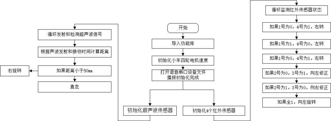 ## 红外循迹+超声波避障 ### 一、认识声波 >声波的性质: 声波是声音的传播形式,声波是一种机械波,由声源振动产生,声波可以被接收器记录,通过分析接收到的声波相位、振幅等动力学特征,可以得到介质的物理性质和力学特征。 声波探测的原理: 声波发射器向某一方向发射声波,在发射时刻的同时开始计时,声波在空气中传播,途中碰到障碍物就立即返回来,声波接收器收到反射波就立即停止计时。声波在空气中的传播速度为340m/s,根据计时器记录的时间t,就可以计算出发射点距障碍物的距离(s),即:s=340t/2 ### 二、认识超声波传感器 >超声波传感器是将超声波信号转换成其它能量信号的传感器。超声波是振动频率高于20kHz的机械波。它具有频率高、波长短、绕射现象小,特别是方向性好、能够成为射线而定向传播等特点。超声波对液体、固体的穿透本领很大。  小车配套的超声波传感器由1个发射器和1个接收器组成,并通过其连接到主控的GPIO引脚进行通信。需要使用GPIO库来读取传感器的状态,小车主控连接超声波发射器和接收器的GPIO比引脚号分别是449、474。 <div style="text-align: center"> <table style="display: inline-table; margin: 0 auto"> <tr> <td></td><td></td><td></td> </tr> <tr> <td>传感器编号</td> <td>发射器</td> <td>接收器</td> <tr> <td>GPIO引脚号</td> <td>449</td> <td>474</td> </tr> </table> </div> >使用发射器和接收器的端口号初始化一个超声波传感器对象(Ultrasonic),就可以控制和检测超声波信号了。可以根据超声波的发射和接收的间隔时间(Ultrasonic对象的output_time()方法)来判断小车前方的障碍物,并控制小车及时躲避。 ### 三、程序流程  ### 四、程序实现 from time import sleep from bot.utils import Voice from tool import * import time import os import sys import json import math import numpy as np from bot.ugv import Motor from sensor import Ultrasonic,Infrared import cv2 as cv from cap import VideoCapture def Ultrasonic_get_distance(sonic): # Echo引脚高电平持续时间就是超声波由发射到返回的时间,即用时间x声波速度/2等于单程即超声波距物体距离值 distance = sonic.output_time() * 340 / 2 * 100 # t2-t1时间单位s,声波速度340m/s,x100将距离值单位m转换成cm # print("distance is %d" % distance) # 打印距离值 if distance < 500: # 正常检测距离值 # print("distance is %d"%distance) DISTANCE = round(distance, 2) else: print("distance is 0") # 如果距离值大于5m,超出检测范围 DISTANCE = 0 return DISTANCE if __name__ == "__main__": #超声波传感器引脚脚号 TRIG=449 ECHO=474 #初始速度 speed=2500 # #红外循迹传感器引脚脚号 io1=444 io2=496 io3=443 io4=510 # 初始化语音模块 voice_ = voice() try: sonic = Ultrasonic(TRIG,ECHO) except Exception as e: voice_.send(250) print(f"初始化超声波模块异常:{e}") sys.exit(1) # 退出程序,返回非零值表示异常退出 try: infrared1=Infrared(io1) infrared2=Infrared(io2) infrared3=Infrared(io3) infrared4=Infrared(io4) except Exception as e: voice_.send(250) print(f"初始化红外传感器异常:{e}") sys.exit(1) # 退出程序,返回非零值表示异常退出 Control_Motor.GS_run(speed,speed) flag_turn=0 status_run=0 try: cap = VideoCapture() except Exception as e: # 语音:未检测到摄像头 voice_.send(248) print(f"初始化摄像头异常,error: {e}") time.sleep(5) exit(0) voice_.send(116) while True: try: #获取距离 dis = Ultrasonic_get_distance(sonic) print("dis:",dis) #读取io口当前接收状态 io1_status=infrared1.Read_Status() io2_status=infrared2.Read_Status() io3_status=infrared3.Read_Status() io4_status=infrared4.Read_Status() #打印io口状态,方便调试 print("io:",io1_status,io2_status,io3_status,io4_status) if int(dis) < 25:#距离小于25cm duobi=1 else: duobi=0 if duobi==0: if io1_status==0 and io4_status==1: speed_L=speed-1200 speed_R=speed+1200 Control_Motor.GS_run(speed_L,speed_R) flag_turn=0 status_run=0 elif io4_status==0 and io1_status==1: speed_L=speed+1200 speed_R=speed-1200 Control_Motor.Advance() Control_Motor.GS_run(speed_L,speed_R) flag_turn=0 status_run=1 elif (io2_status==0 and io3_status==0) and (io1_status==1 or io4_status==1): speed_L=speed speed_R=speed Control_Motor.Advance() Control_Motor.GS_run(speed_L,speed_R) flag_turn=0 elif (io2_status==0 and io3_status==1) and (io1_status==1 or io4_status==1): speed_L=speed-500 speed_R=speed+500 Control_Motor.GS_run(speed_L,speed_R) Control_Motor.Advance() flag_turn=0 status_run=0 elif (io2_status==1 and io3_status==0) and (io1_status==1 or io4_status==1): speed_L=speed+500 speed_R=speed-500 Control_Motor.GS_run(speed_L,speed_R) Control_Motor.Advance() flag_turn=0 status_run=1 elif io1_status==1 and io2_status==1 and io3_status==1 and io4_status==1: if flag_turn>25: speed_L=1500 speed_R=1500 Control_Motor.GS_run(speed_L,speed_R) if status_run==0: Control_Motor.Rotate_Left() else: Control_Motor.Rotate_Right() flag_turn=flag_turn+1 else: Control_Motor.Stop() time.sleep(0.01) elif duobi==1: Control_Motor.Stop() print("前面有障碍") time.sleep(2) if has_digit_input() == 'q': break except KeyboardInterrupt: break #释放资源 Control_Motor.close() infrared1.close() infrared2.close() infrared3.close() infrared4.close() sonic.close() cap.release() voice_.close() print("END----------------------")