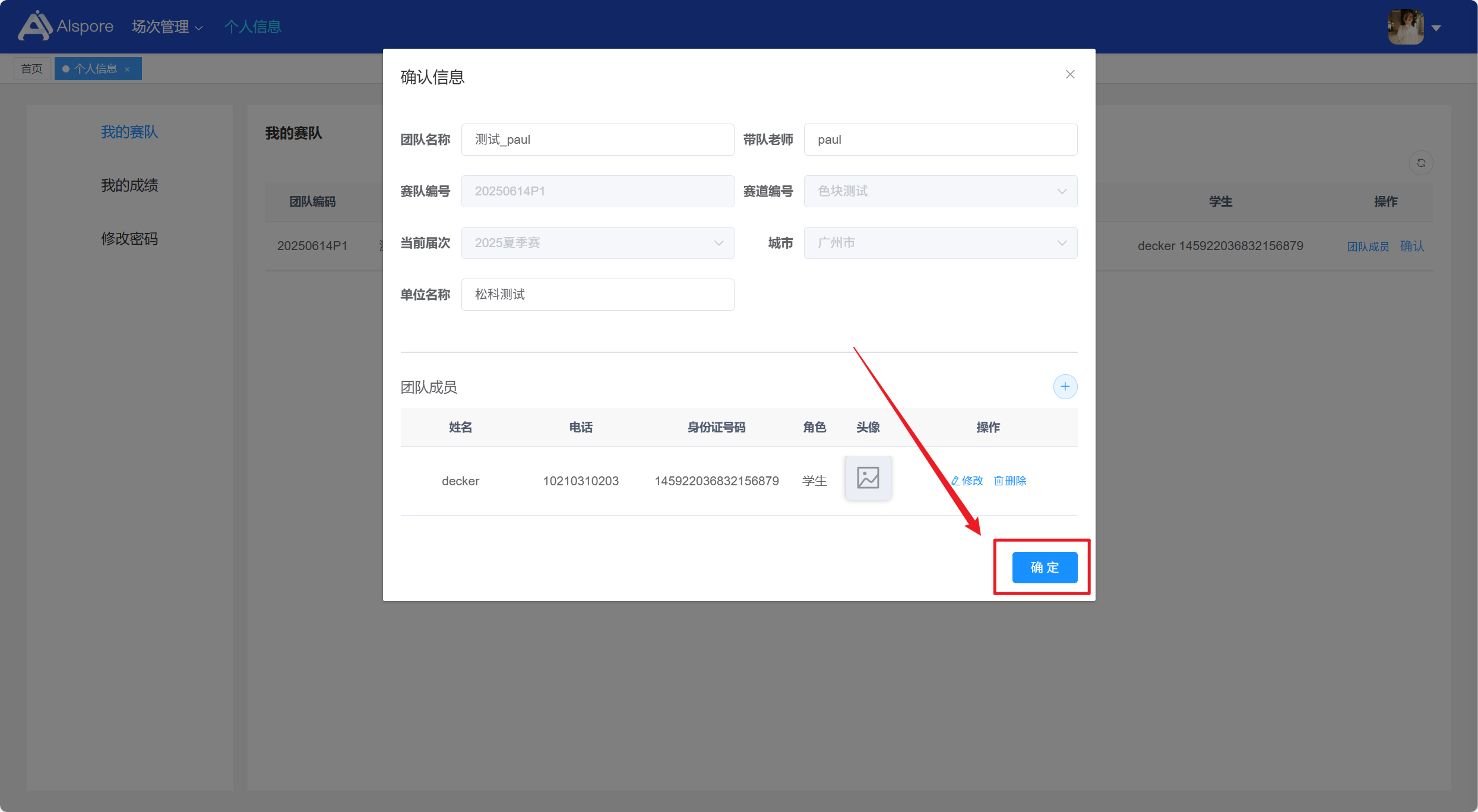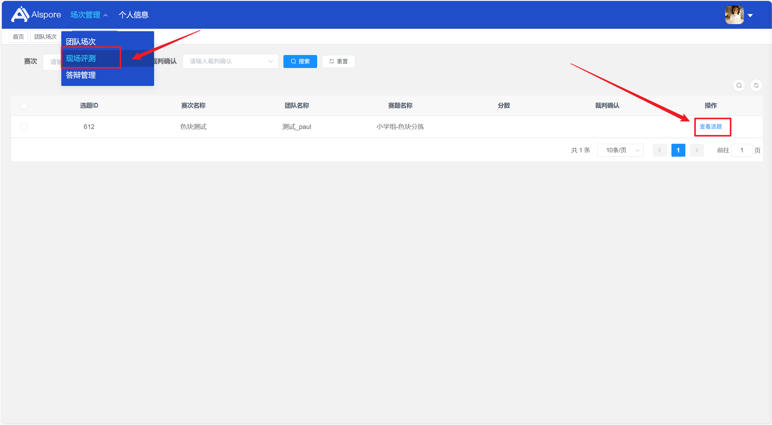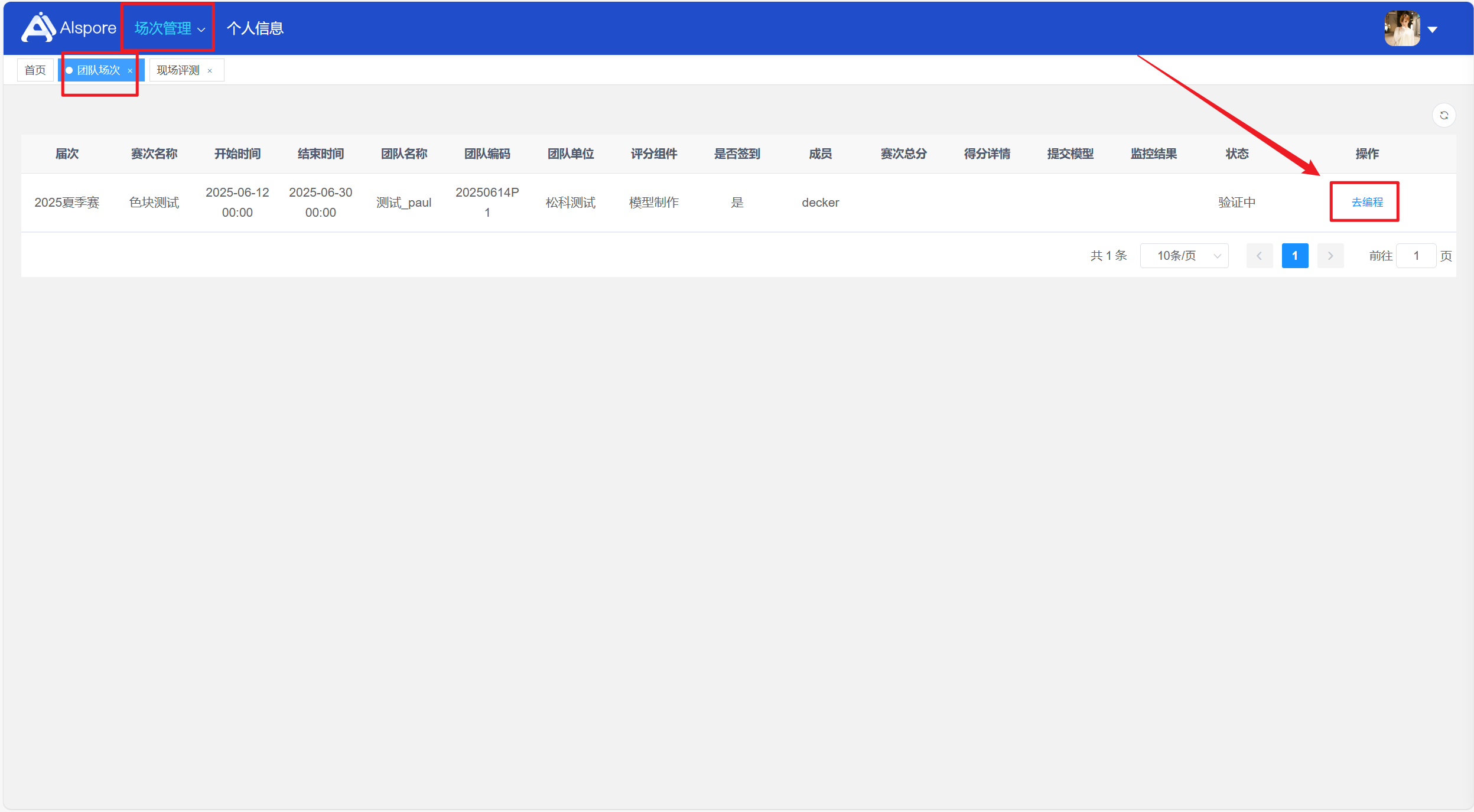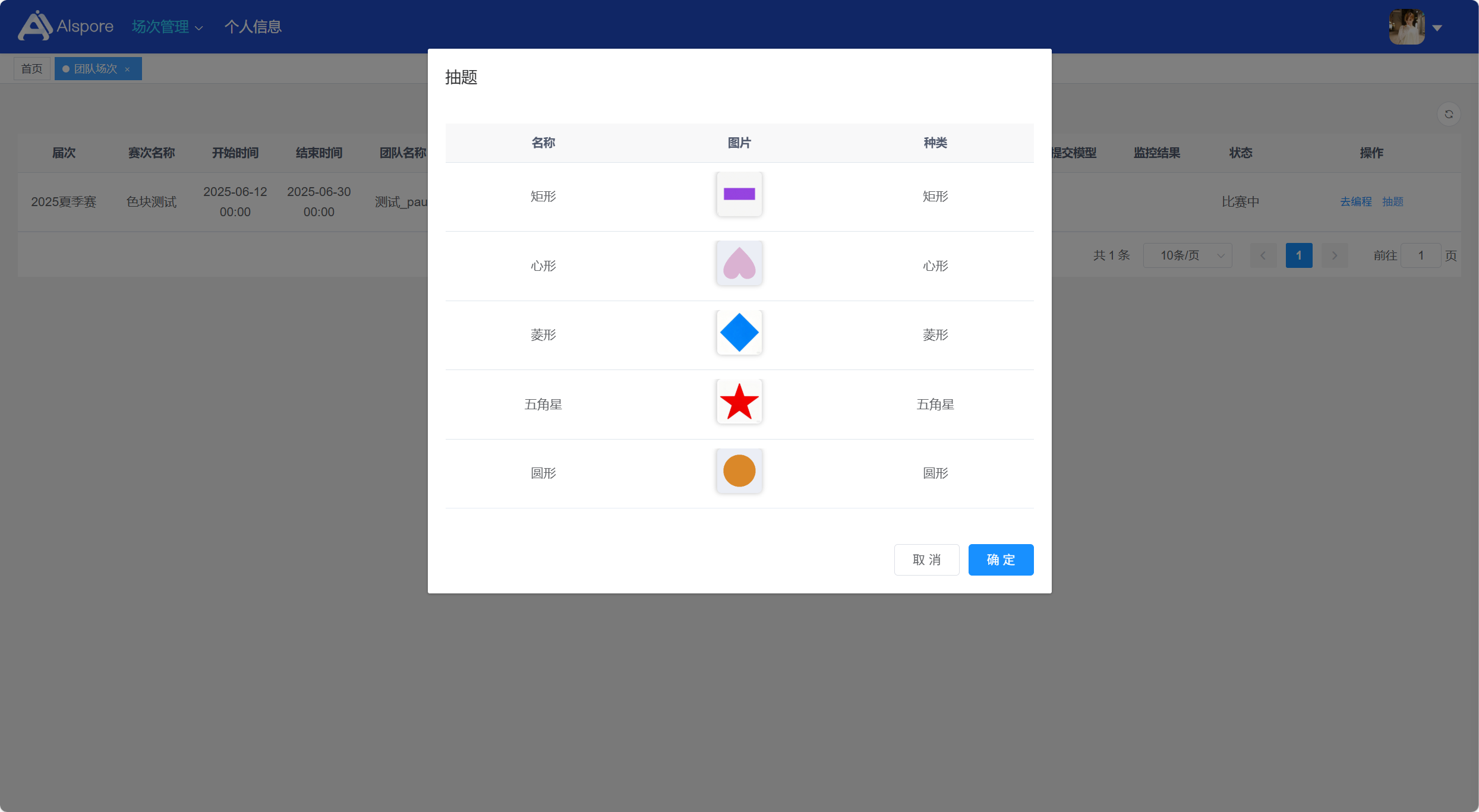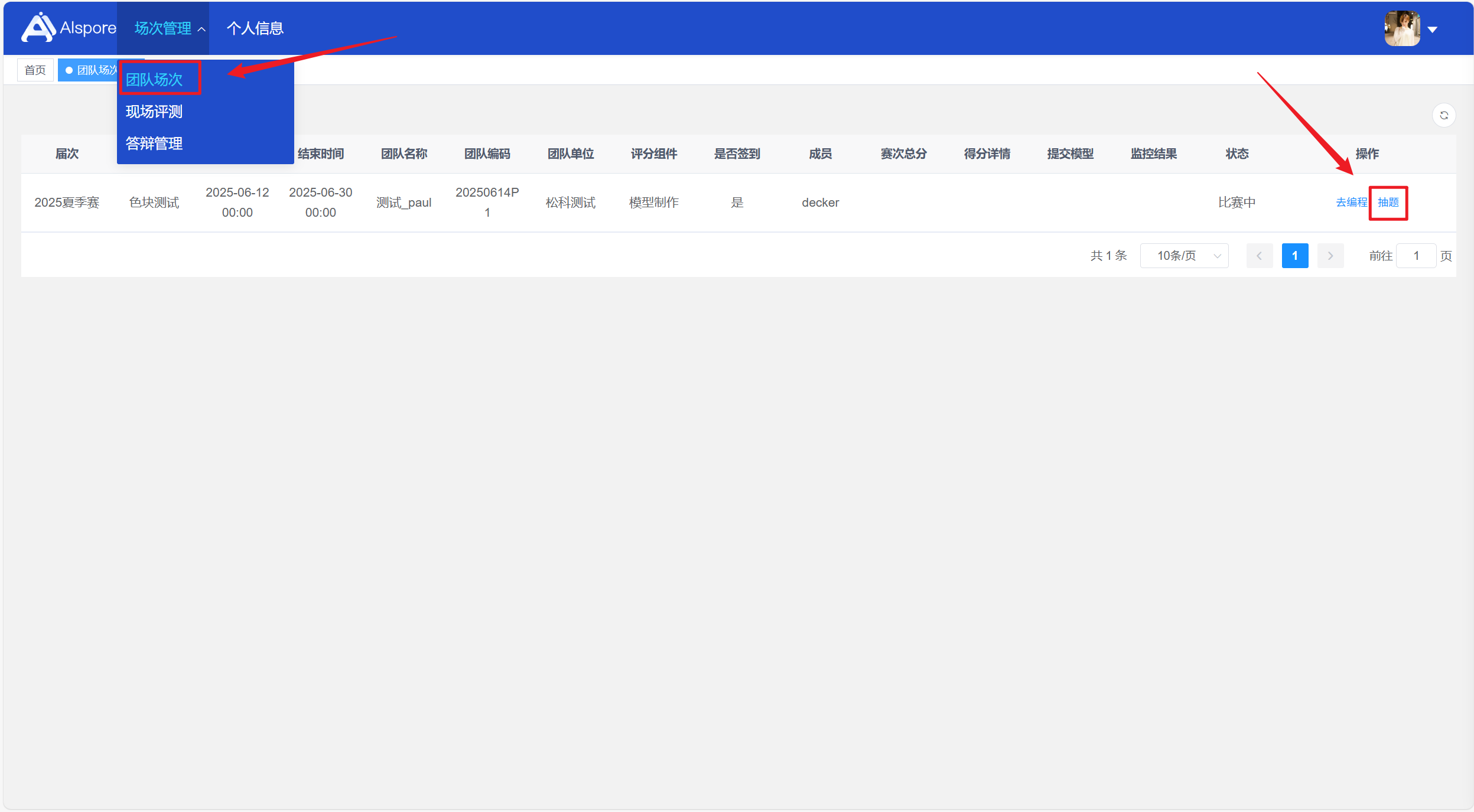 # 竞赛平台网址 https://ct.aispore.cn/ # 01-登录 输入团队编号与密码登录账号。 <img src="/media/202506/2025-06-13_173449_9986540.5350836378962963.png" alt="图片1" style="width: 45%; height: auto;"> # 02-团队信息确认 菜单栏选择“个人信息”,点击“确认”。 <img src="/media/202506/2025-06-14_170250_4271340.5969420480502847.png" alt="图片1" style="width: 100%; height: auto;">  # 03-抽题 确认信息后回到“场次管理”菜单,选择“团队场次”,点击“抽题”即可进行抽题。  `注意:只有“色块分拣”(小学组)和“垃圾分类”(初中组)的团队需要抽题。“简易计算”(高中组)的团队无需抽题。` 根据不同赛项,获取各组不同的比赛题目。  # 04-查看抽题 如果忘记自己抽取的题目,可以在“现场评测”页面查看选题。  # 05-去编程 抽题完成后,回到“团队场次”,点击“去编程”,即可跳转到编程平台进行模型制作等操作。  # 06-模型制作 进入编程平台后,初赛选择“模型制作”。